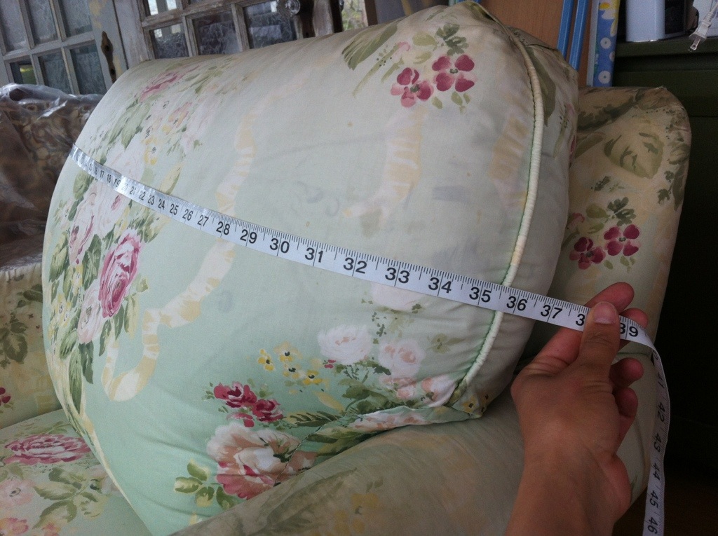 Begin with the inside back. Measure from side to side first (always!) and then up and down. Allow an extra 2 to 3 inches for extra padding and folding under.