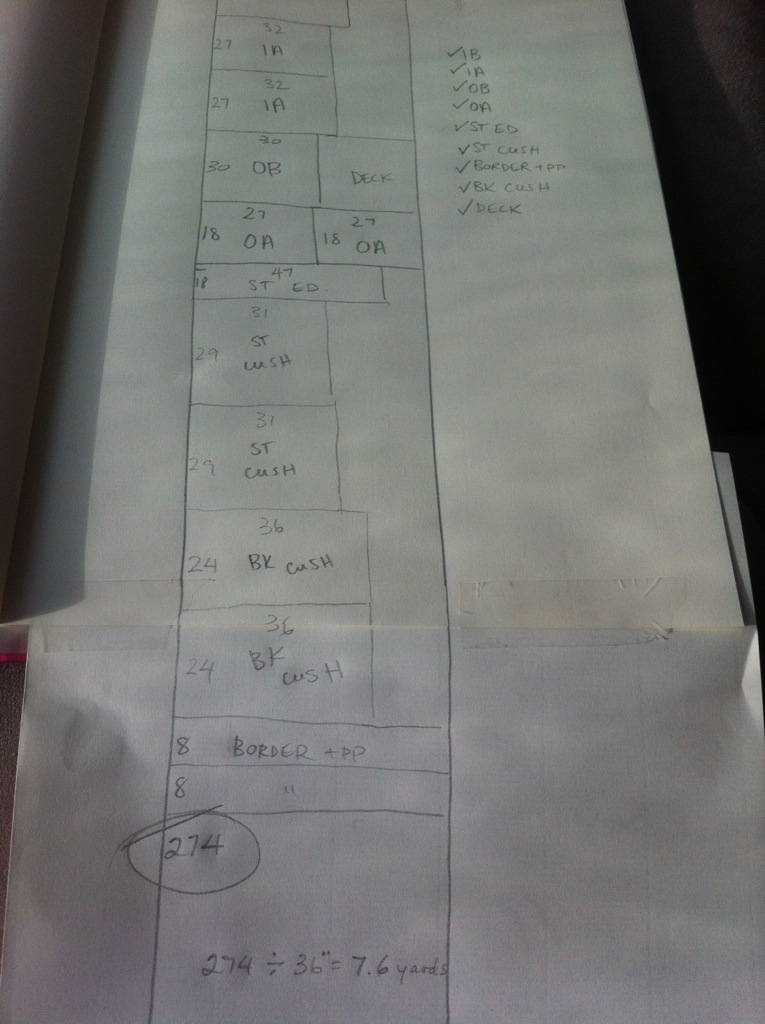 You’ll divide that number by 36 (inches in a yard) to get 7.6. Round up to 8 yards. There is quite a bit of scrap here, because of the large measurements. It can be used for armcaps or toss pillows. Please note **if you choose a large scale pattern always purchase 25% more to take into account the matching!