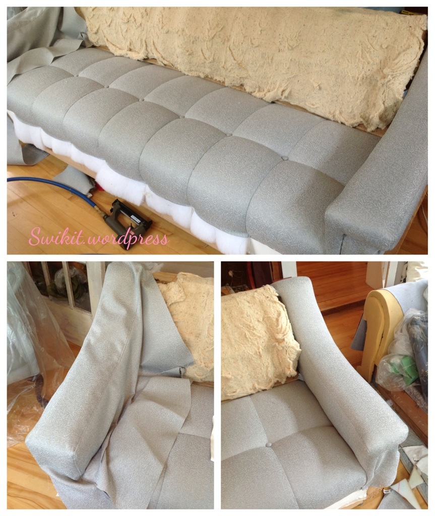 This very vintage looking blue-grey, lightly patterned fabric has replaced the old. I have reused the old foam, but added thick layers of felt and bonded polyester to freshen the sofa and give it added fullness.