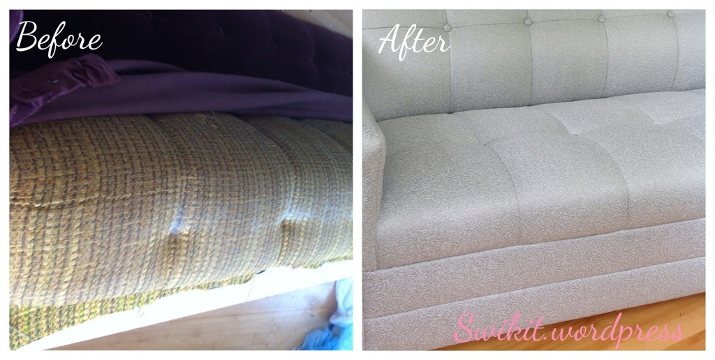 Last week, I posted about this sofa, which was a badly recovered retro piece with the original fabric left underneath. It has had some major cosmetic surgery this week! As they say, pictures speak louder than words, so I’ll just cut to the chase for you.