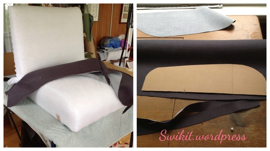 My decision was to make the sides just a little more curvy, and change the piping detail. This will not change the design of the chair; Re-design implies that the frame of the chair has been altered while Re-style is merely a surface change. I made a cardboard template of the new shape of the side, and used it to pad the chair to the new shape. These templates were also used to cut the fabric.