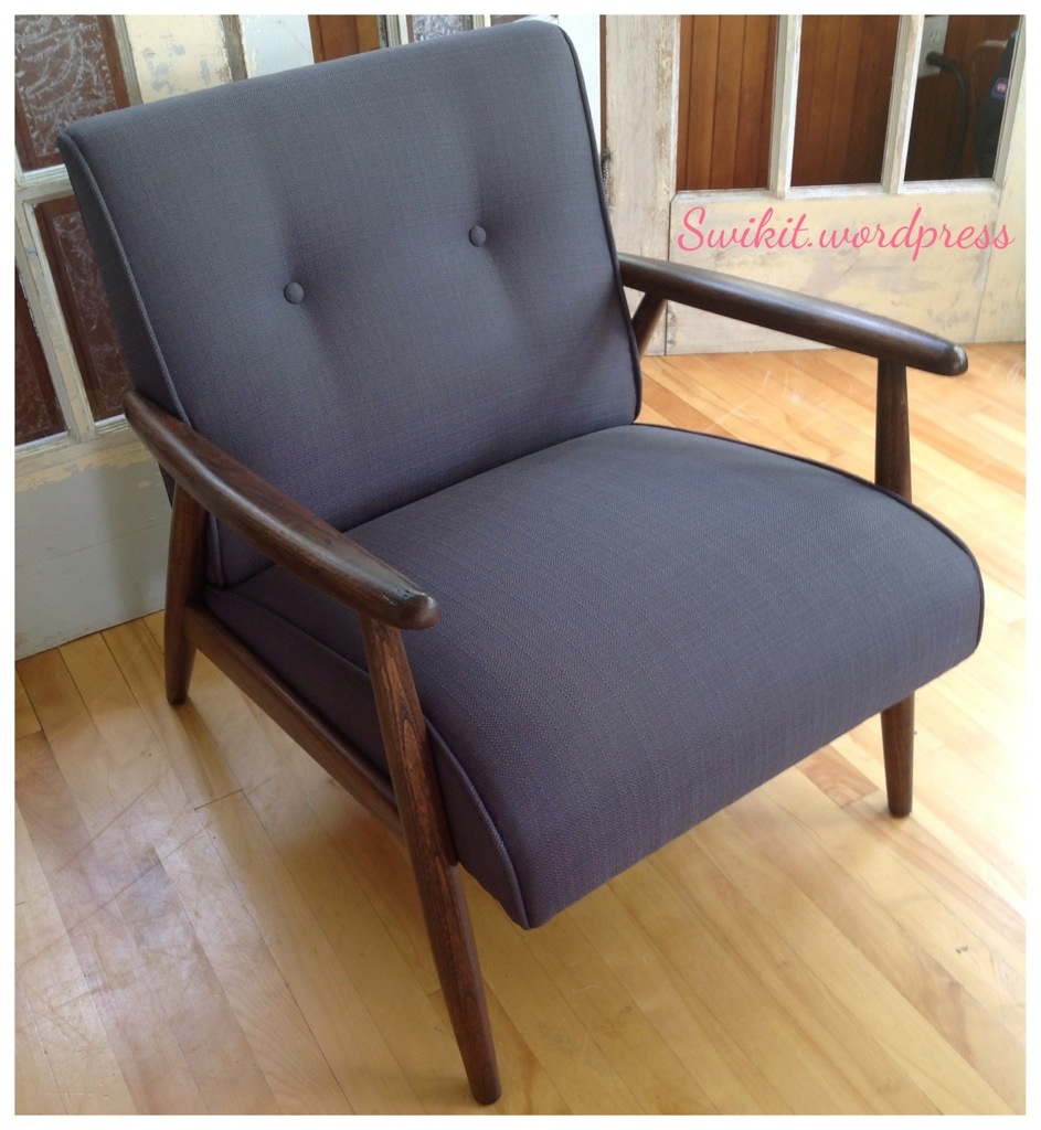 When figuring how I am going to tweak a piece of furniture, I take the client (and the small amount of info I have about them), the design of the piece, and the chosen fabric into account. For instance, a great deal of information can be gleaned from asking a client what they most love about their piece. That answer, combined with the fabric choice – in this case a steely grey – gives me the inspiration I need. With this chair, I want to highlight the modern look, keep clean lines, but make it more contemporary. The choice of fabric makes me want to remove fussy details, so I tried the seat with top stitching instead of piping, but felt it was lacking character. Piping was definitely the way to go with this chair.