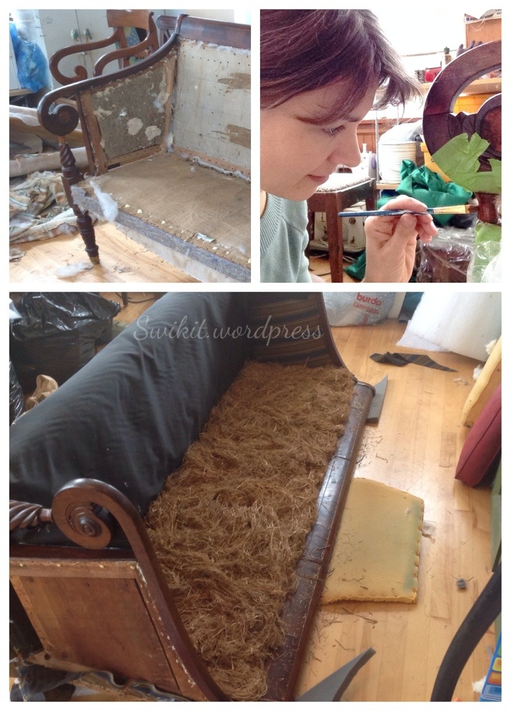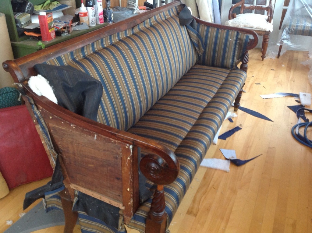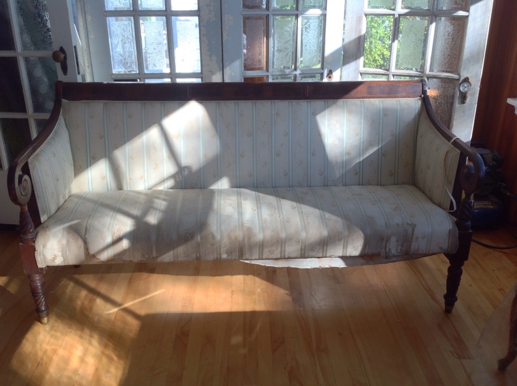 It had been reupholstered (probably many times, as Shawn estimates it to be from the 1820s) and all the original stuffing replaced with foam. It was a great looking piece, and comfortable with foam, but Shawn is interested in maintaining the authenticity of antique pieces. Out with the foam, in with the straw!