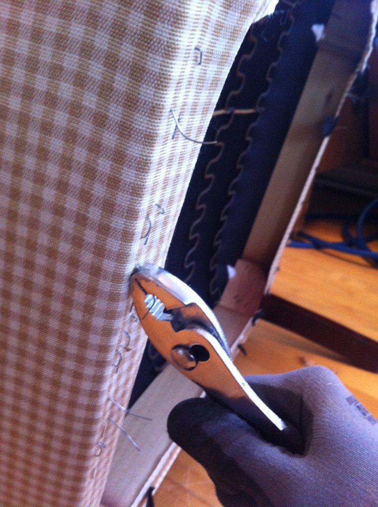 Using your pliers, rip the fabric off the base of the piece. You don’t have to be careful, or pull out every staple. Rip it off using your whole arm, NOT your wrist. Try to use a strong, sideways ripping motion to get the fabric off in one or two pulls.