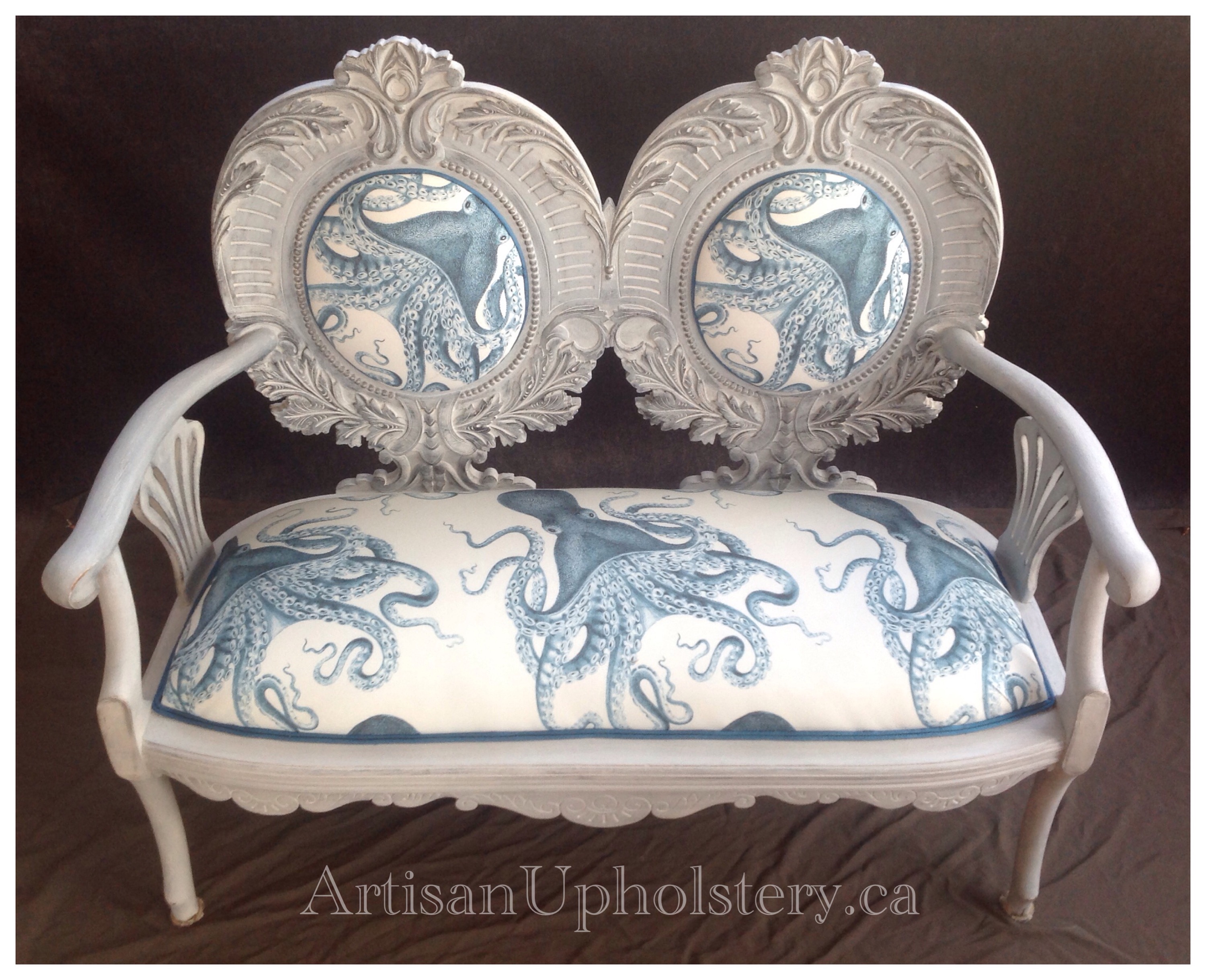 Gorgeous antique settee, upholstered in this fabulous octopus print. This piece has been fully stripped and repaired, with new webbing, new foam and the original coil springs.