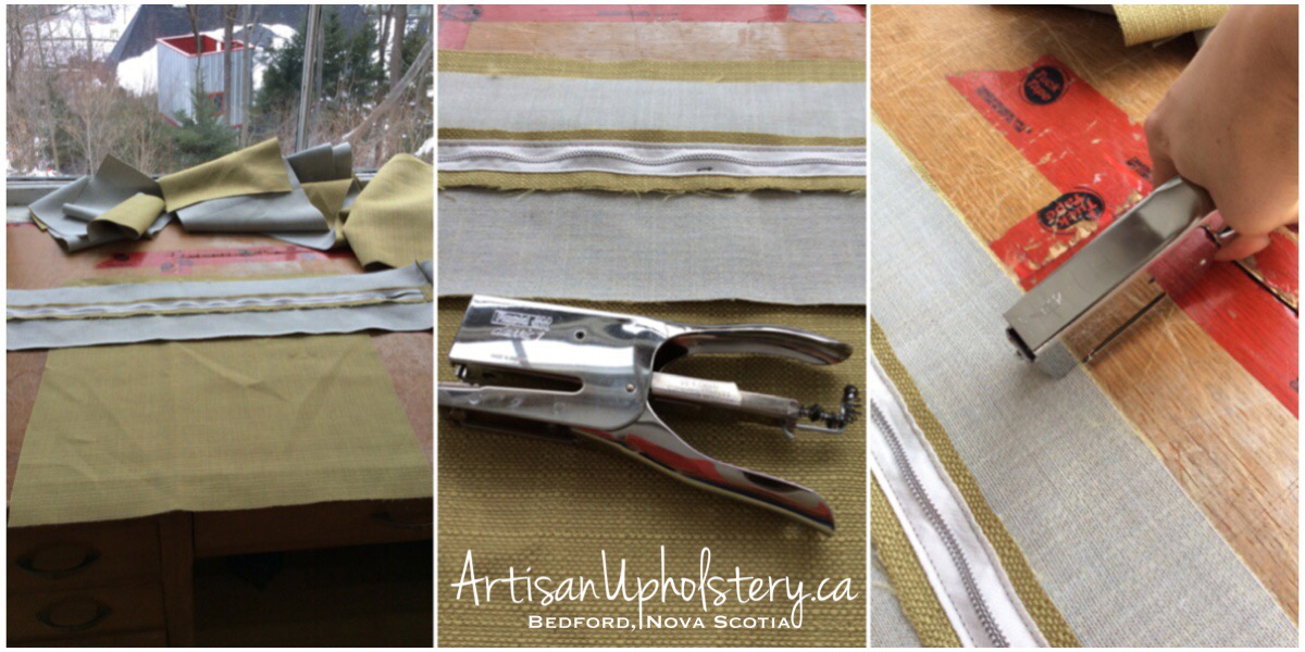 Step 3. With the zipper panel centred, begin stapling the border to one of the cushion panels.