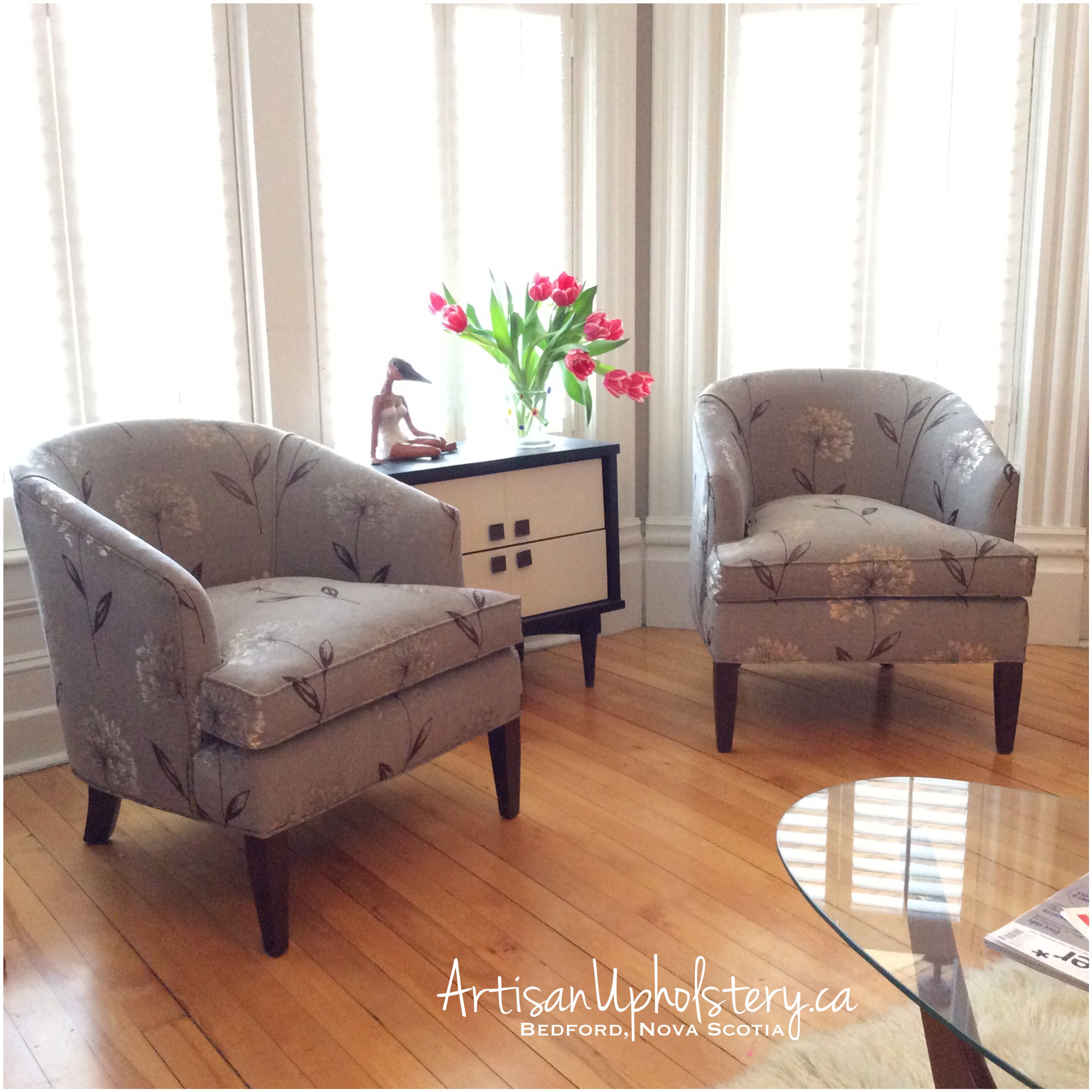 This vintage set of tub chairs will make a gorgeous addition to any home. The fabric is a neutral, warm grey jacquard, and the flowers have a really lovely lustre.