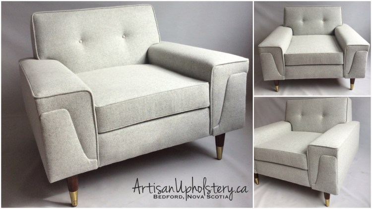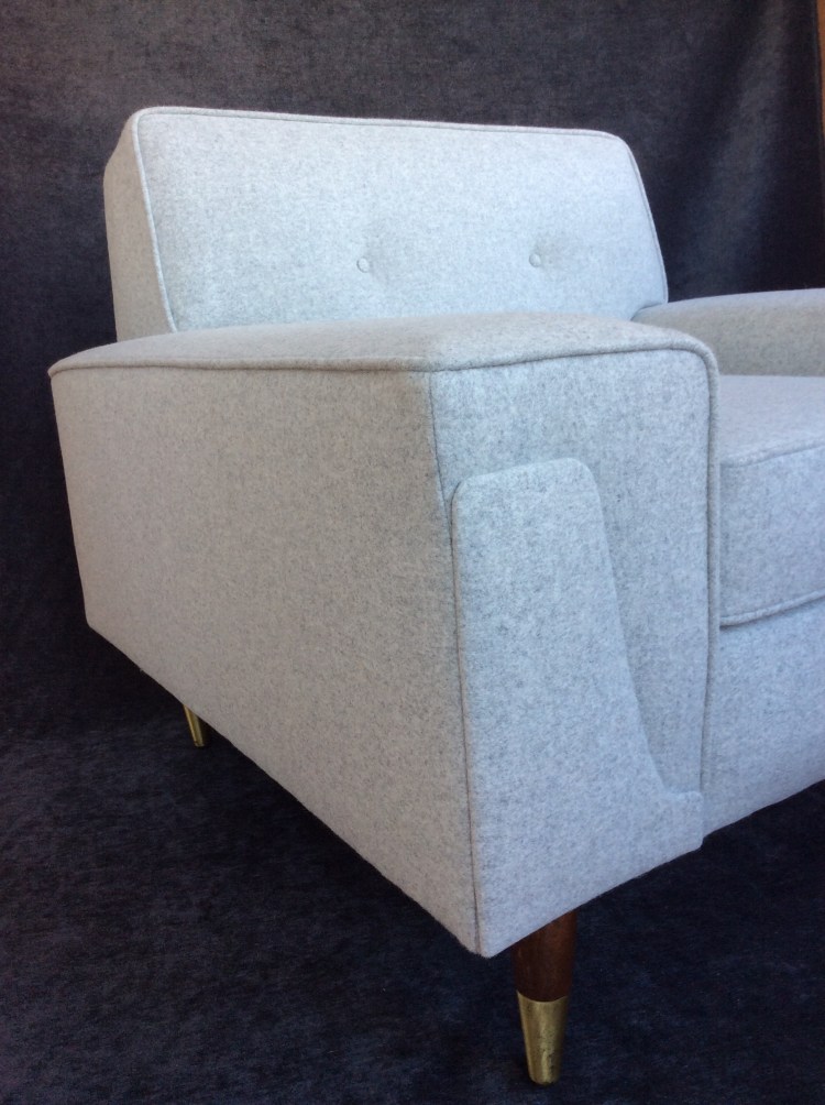 Fresh off the bench! A boxy, comfy, retro chair reupholstered in Maharam ‘Divina Melange’ by Kvadrat, in light grey.