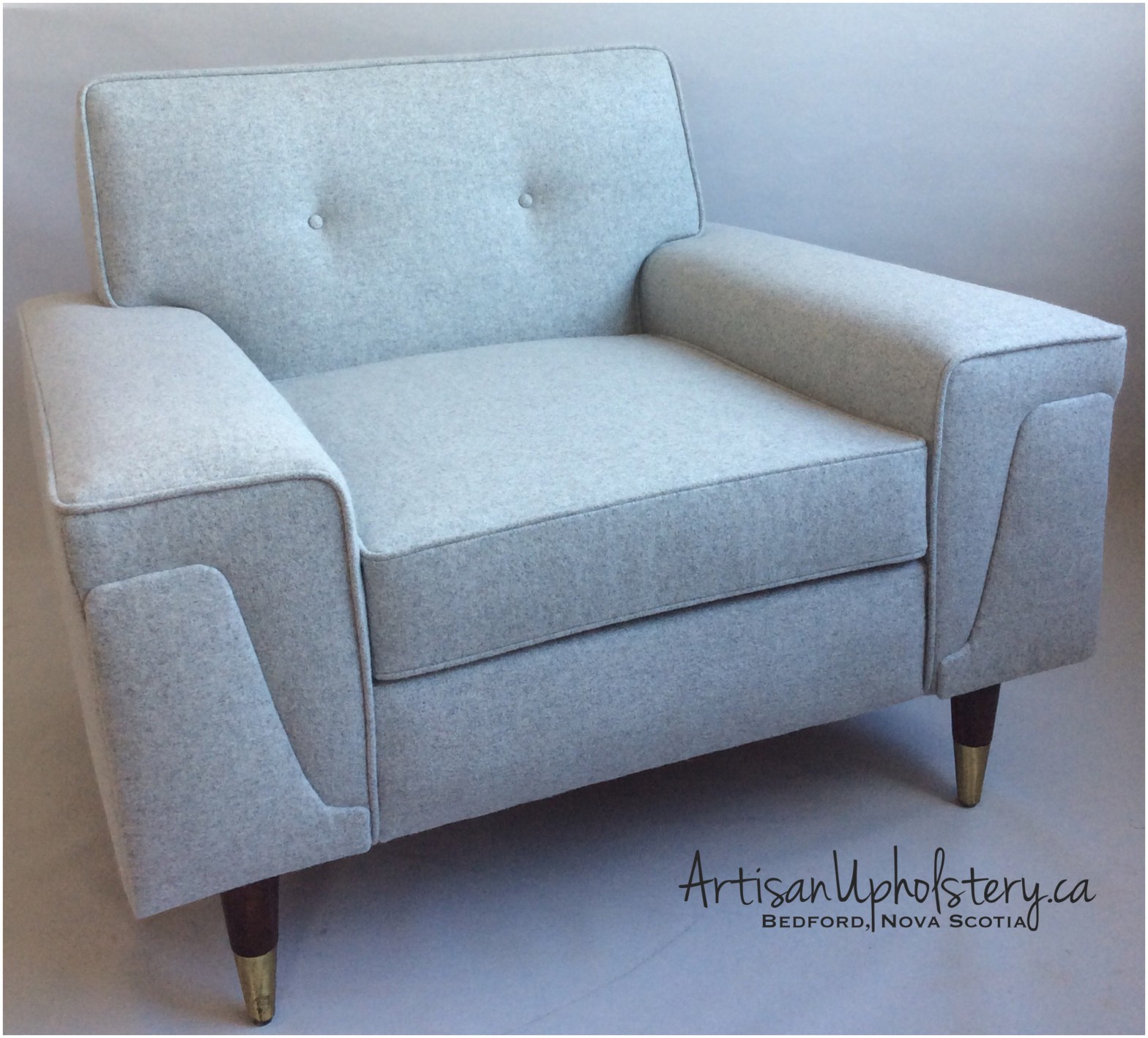 This chair features a hardwood frame, coil spring construction in the seat and back, and lovely tapered legs. It has been stripped to the bare frame and has all new foam and materials. The 100% wool fabric is very durable.