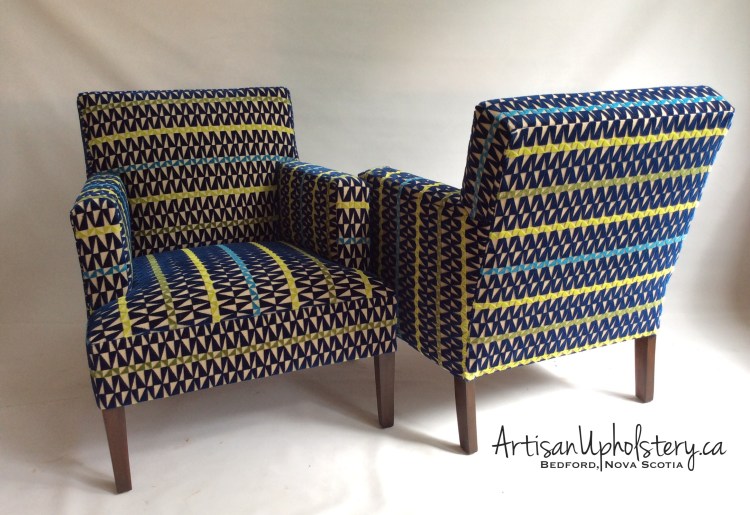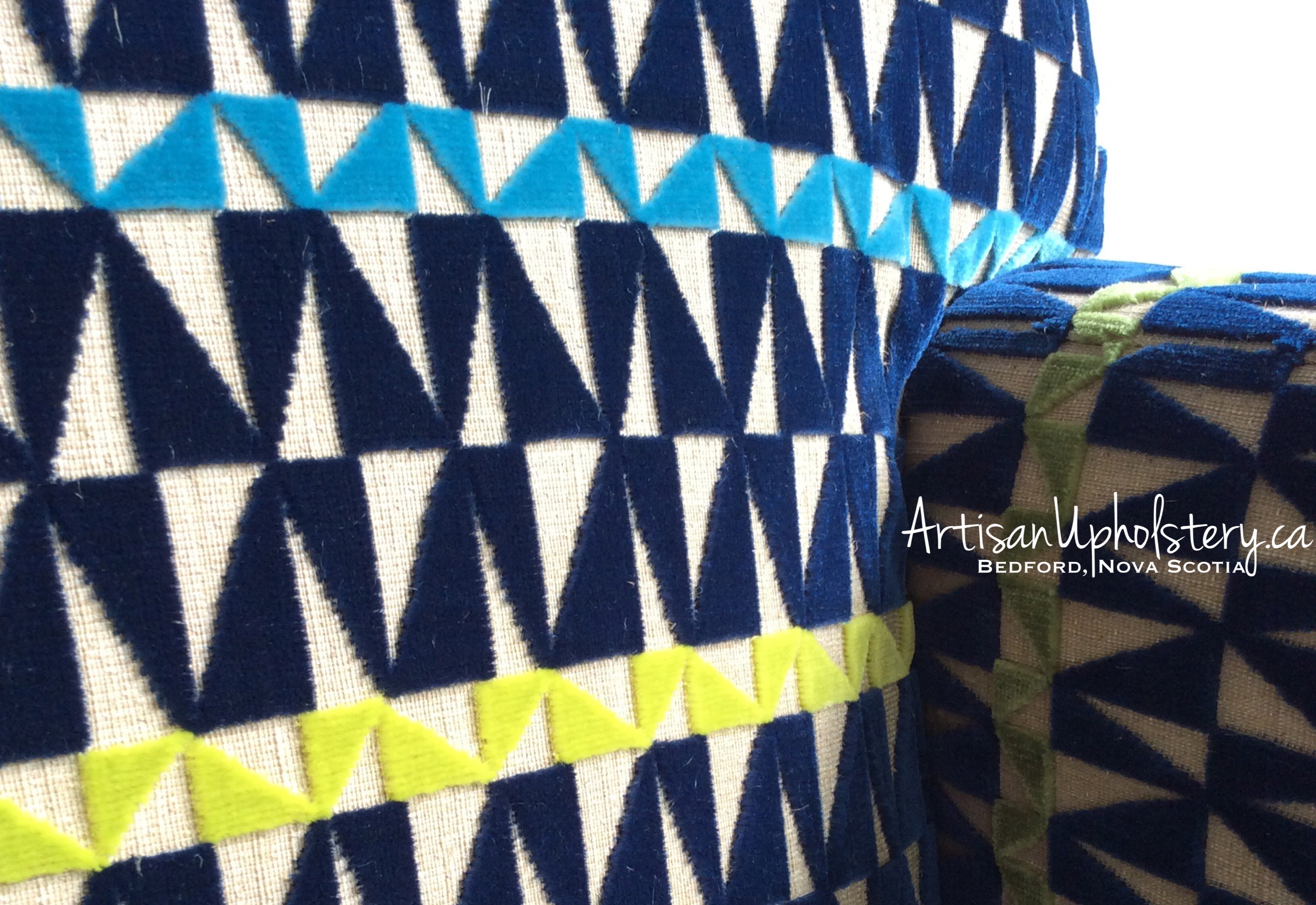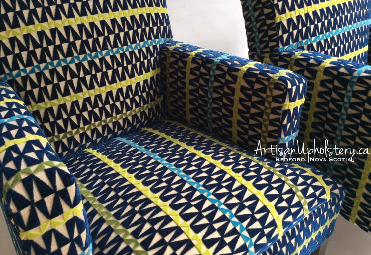 These vintage chairs have been completely stripped to the frame, and rebuilt with all new foam and materials. Super comfy, lush and funky. The fabric is a cut velvet by Knoll.