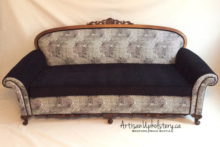 The goal was to give a hand-me-down sofa some character. Working together, we found the perfect fabric to update this antique to make it work with their very funky space.