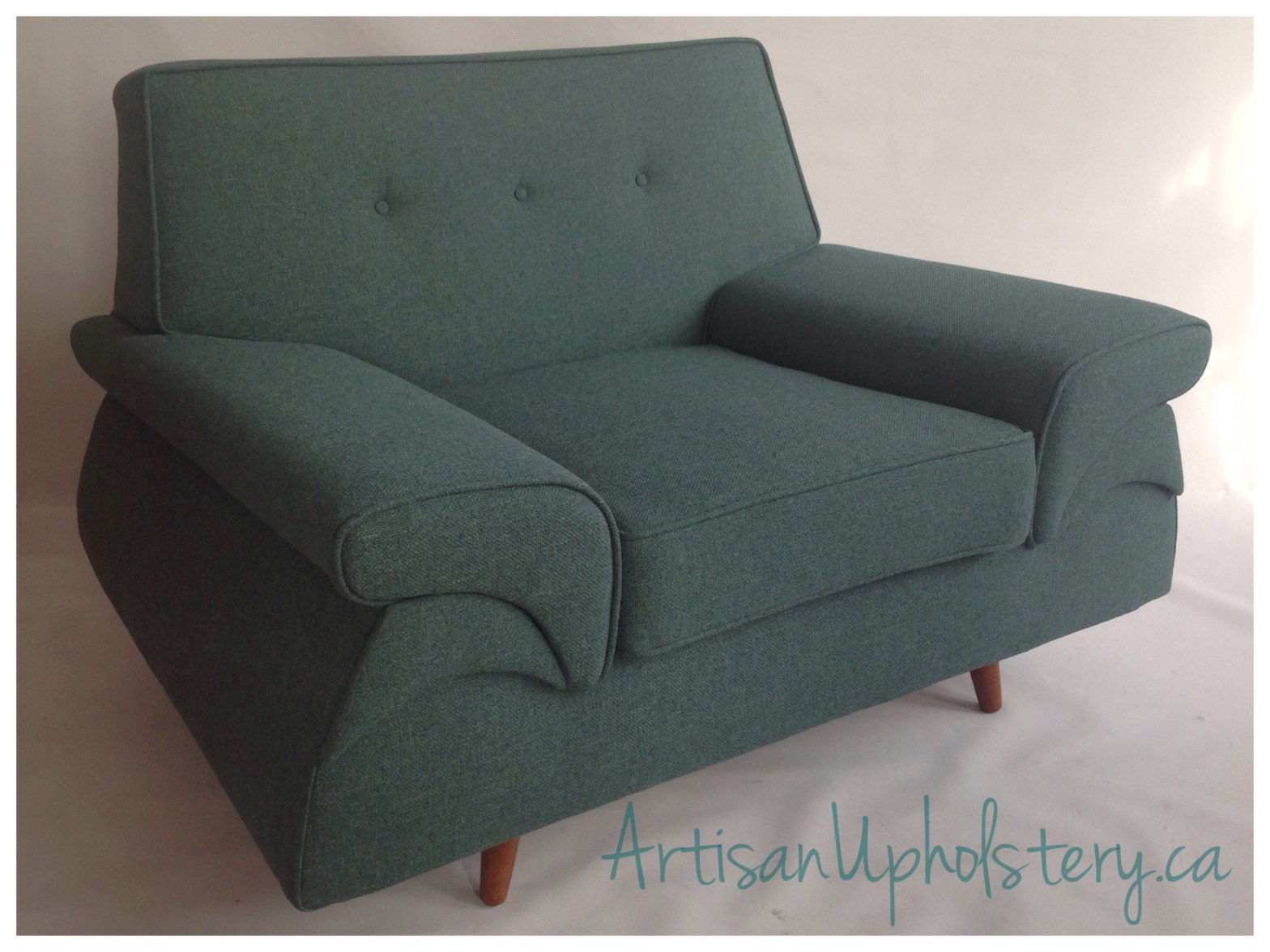 This vintage chair has been stripped to the frame, with all new foam and padding added. The authentic teal green fabric completes the retro look. Free delivery to Halifax/Bedford/Dartmouth.